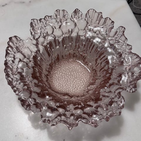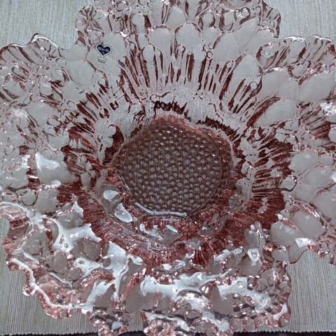 Riihimäen Lasin roosa Solina tarjoilukulho 80-luvulta. Halkaisija 26 cm, korkeus 10 cm. Erittäin hyväkuntoinen.(Mahdollisuus ostaa samalla pikkukulhot, halk. n. 12 cm, toinen hieman eri sävyinen, yht. 10 e) Kaikki 3 yht. 28 e