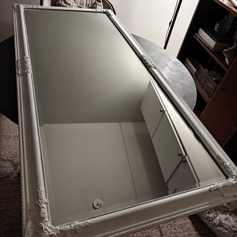 Jysk koristeltu peili, jossa on yksityiskohtaisesti muotoillut koristeet kehyksessä. Peilin runko on hopeanvärinen ja siinä on klassinen koristekuviointi. Peilin takaosa on tehty kahdesta palasta (tehtaalla siis) ja ne eivät ole pysyneet tehtaan teipillä tasaisena, joten sen takia on teippiä takana, jotta tasot ovat samalla tasolla. Ei vaikuta peilin käyttöön mitenkään.
