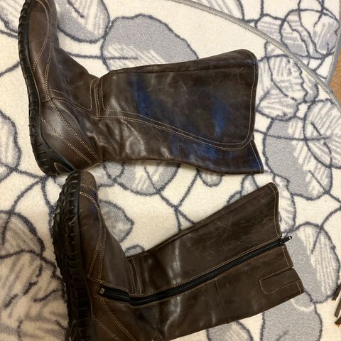 Mustat pitkävartiset Ecco nahkasaappaat. Vetoketju ja soljet, joilla voi säätää varren leveyttä. Varsi melko leveä. Kantalaput on vaihdettu hyvälaatuisiin, jotka ovat vähemmin liukkaat kuin alkuperäiset. Kengissä on pientä kulumaa siellä täällä.