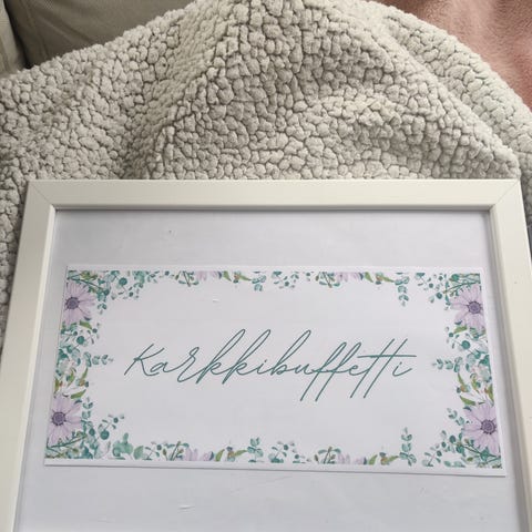 Ikean valokuvakehykset (11 kpl) ja herra ja rouva-kortit. Valokuvakehykset ovat kaksipuoleisia. Meillä oli toisella puolella menu ja toisella puolella ohjelma.