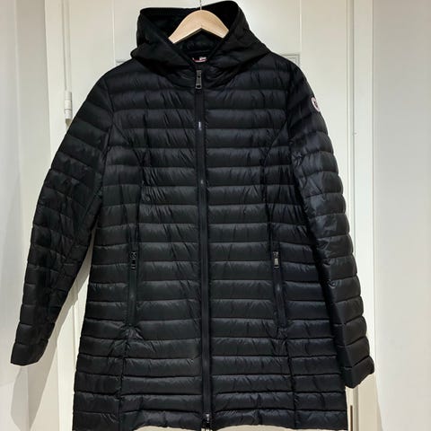 Valkoinen kevytuntuvatakki 90 untuvaa 10 höyhentä. Tyköistuva malli, mielestäni lähempänä kokoa XL. Kai-kai mitta n. 55 cm, olka-helma n. 66 cm.