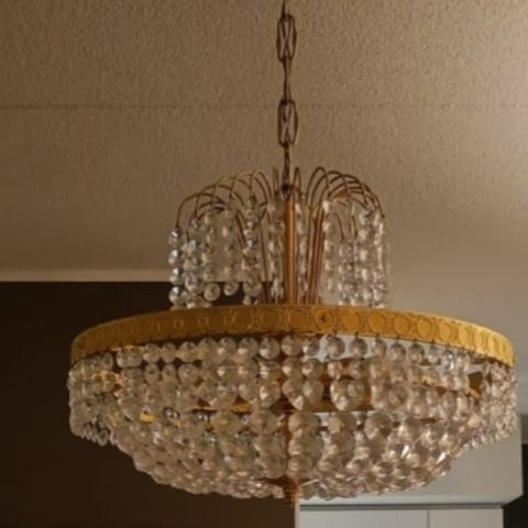Kristallikruunu, jossa on viisi kynttilänmuotoista valonlähdettä. Kruunu on valmistettu kullanvärisestä metallista ja koristeltu kirkkailla kristalleilla, jotka heijastavat valoa. Sopii sisätilojen valaistukseen ja koristeeksi.Kruunu on puhdistettu.