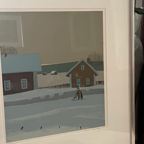 Kehyksen maali hieman irronnut aivan lasin vierestä. Ei näy taulua edestä katsottaessa.