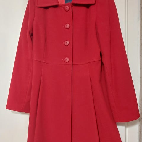 Piretta puolipitkä, upean punainen villakangastakki, koko 44. Materiaali 70% puhdasta uutta villaa, 20% polyamidia ja 10% kashmiria. Sivutaskut, täysin vuoritettu ja isot napit, varanappi tallella. Hienossa kunnossa.