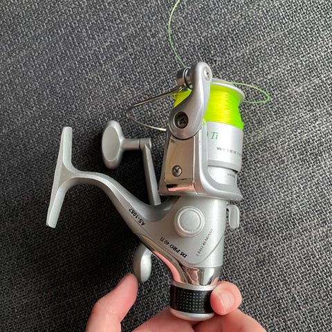 Kesän käytetty kela jossa on valmiiksi hyvä siima.Kampi toimii hyvin ja räikkä