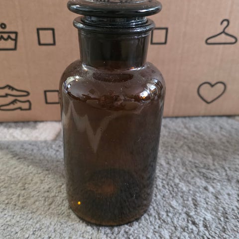 Vanha kirkaslasinen korkillinen apteekkipullo; korkeus 15 cm, pohjan halkaisija 7,2 cm ja vetoisuus 4 dl. Korkin kärkiosassa pieni lohkeama.