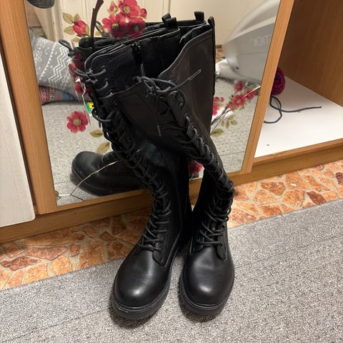 Käyttämättömät, uudet mustat nilkkurit, nauhat edessä sekä vetoketju sisäsivulla, paksu kuvioitu pohja.