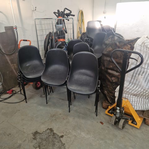 Lasten pöytä ja pinnatuolit. Jostain -90 luvulta, vaatii korjausta: pinnat kaikissa kuluneet, pöydän yksi jalka halki juurestaan (pöytä pysyy pystyssä) ja toisen tuolin pinnat vähän irti rei'istään. Säilytetty osin sisällä ja osin ulkovarastossa. Taitava voinee fiksailla näistä vaikka koristeeksi.