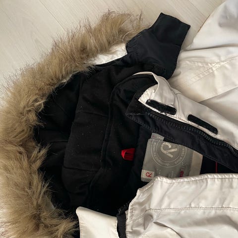 Reimatec talvitakki, koko 116. Kulumaa, käytönjälkiä ja haalistumista on jnkv (ks kuvista minkätyyppistä). Vetoketjut ehjät, kauluksen tarrat tarttuu, mutta alempana vetoketjun päällä olevat tarrat ei enää kunnolla. Pesty vain kerran tai pari. Lämmin takki edelleen. Savuton ja eläimetön talous.