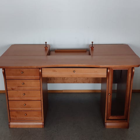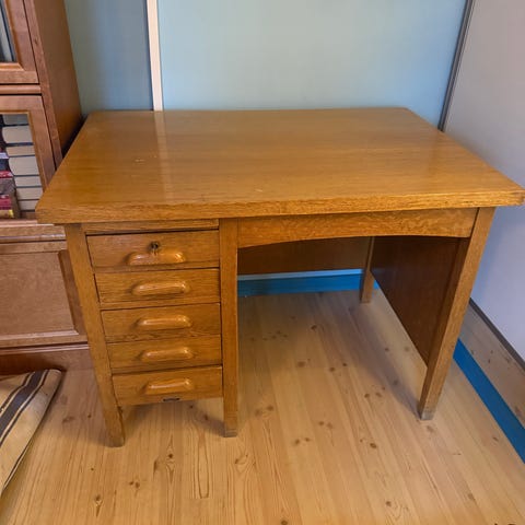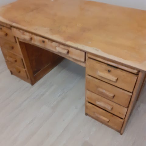 Tamminen Billnäsin konttoripöytä toimivalla rulokaapilla muuton tieltä myyntiin. Avain kadonnut. Tukeva ja hyväkuntoinen, pöytäpinnan lakkauksessa pientä kulumaa.