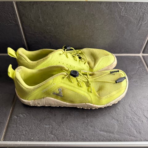 Kevyet Vivo Barefoot paljasjalkakengät, koko 35. Muuten erinomainen kunto, mutta toisen kengän kangaskärjessä pieni reikä.