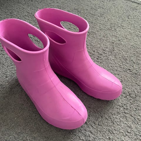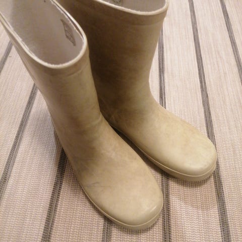 Hai kumisaappaat koko 37. Valkoiset osuudet tummuneet itsestään. Varressa ulkopuolella kirjoitettu kuulakärkikynällä nimi