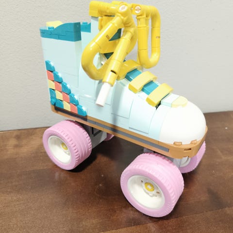 LEGO Creator 3-in-1 rullaluistimet, joissa on vaaleanpunaiset pyörät ja monivärinen kenkämalli. Sarja sisältää rakennuspalikat ja ohjeet kolmen eri mallin kokoamiseen.