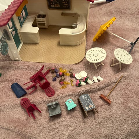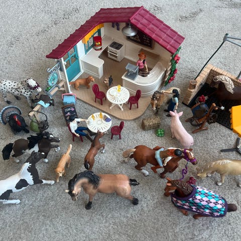 Myydäänn schleich kahvio. Kahviosta puuttuu joitain osia ja on maalattu. Mukana tulee ukko hevonen koira ja kalusteet. Postitus käy.