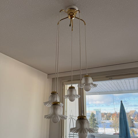 Riippuvalaisin, jossa on kirkkaat muoviset helmiäiskoristelut. Valaisin on suunniteltu kattoon ripustettavaksi ja se sopii sisäkäyttöön. Valaisin luo valoa ja koristeellista ilmettä tilaan. Kunto hyvä, ei kulumia.