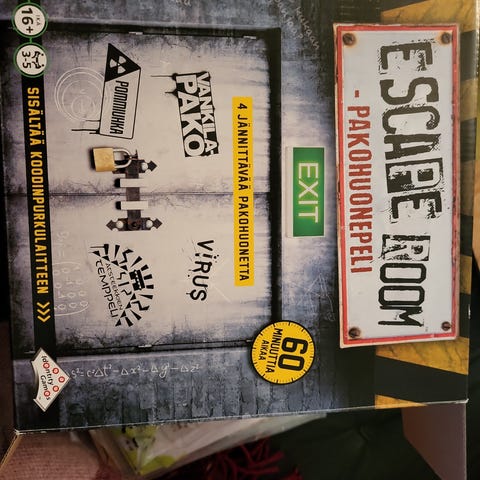 Pakohuonepeli. Kuin uusi muuten mutta paketti harmillisesti rikki, ks. kuva. Huomioitu hinnassa. Liikun alueella Lahti-Heinola-Mikkeli-Savonlinna-Parikkala tai voin lähettää Toridiilillä tai ilman. Tämä on pienikokoinen peli lähetettäväksikin!