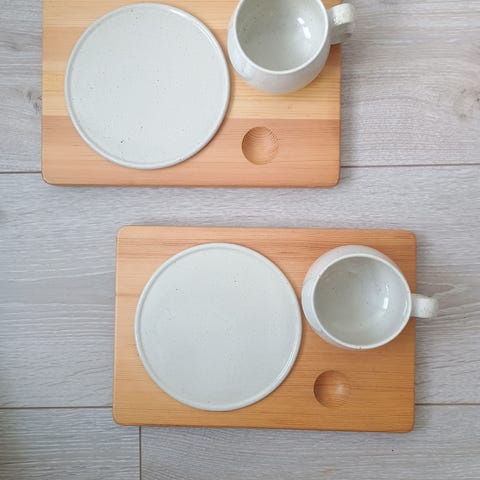 Puinen alusta, keraamiset mukit ja leipälautaset, keraamiikka virheettömässä kunnossa, ei käytön jälkiä.