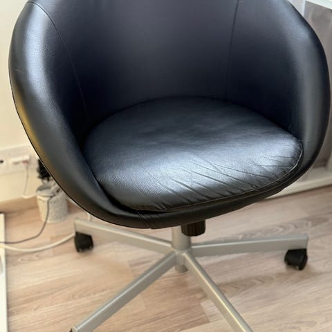 IKEA Kontorsstol pyöreä muotoilu harmaalla kankaalla ja metallisella pyörivällä jalustalla. Sopii toimisto- tai kotikäyttöön. Istuinmukavuus ja liikkuvuus pyörien ansiosta.