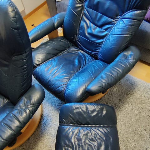 Ostettu 2000-luvulla Vepsäläiseltä, ehkä Bo Concept-mallistoa. Nahkaa, käytön jälkiä jonkin verran. Toisen tuolin selkänojasta irronnut ilmeisesti ruuvi, siksi saa taitettua kuvassa näkyvällä tavalla. Meillä mennyt näin, eli ei haittaa käyttöä.