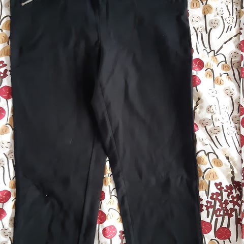 Himmeästi hohtavat ja stretsaavat housut. Materiaalilappu leikattu pois, muuten kunto uudenveroinen. Vyötärö 43,5 cm, haara-lahje 76,5 cm.