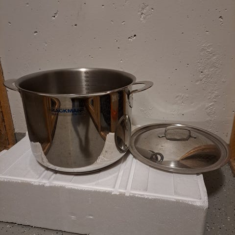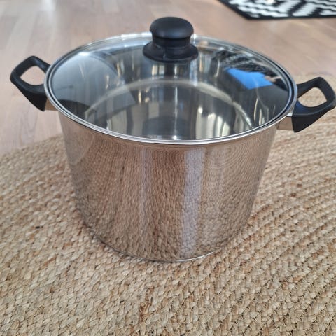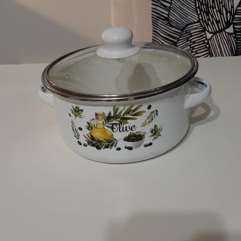 Hyväkuntoinen ehjä teräskattila. Tilavuus 4 litraa. Korkeus 13 cm, halkaisija 20 cm.