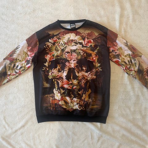 Naisten pääkalloaiheinen paita kokoa L. Kainalo-kainalo 50cm, olka-helma 68cm. Materiaali polyester/elastaani. Pitkät hihat, olkapäiden kohdalta avoinna. Paita on kuin uusi.
