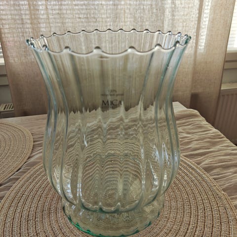 Kaunis lasinen maljakko, kapea suuosa eli yhdelle kujalle hyvä. Muutama naarmu joista kuva