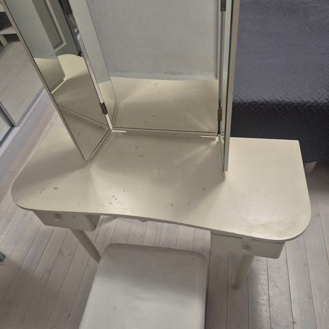 Kiva meikkipöytä. Peilit voisi uusia. Helppo tarvittaessa vaihtaa. Ollut yhdellä omistajalla, kivalla vanhalla rouvalla joka valitettavasti menehtyi.