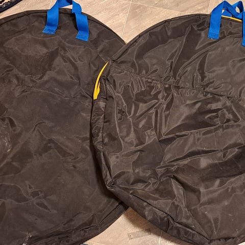 L-kokoinen pyörä mahtuu hyvin kiekot irrotettuna. Sisällä taskut kiekkoja varten.