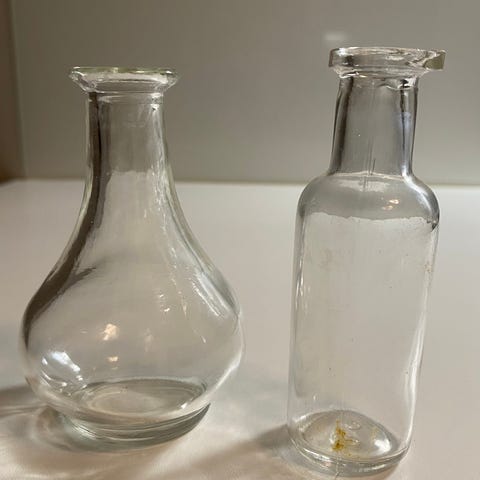 Korkeat kapeat kirkkaat lasipullot yhteishintaan