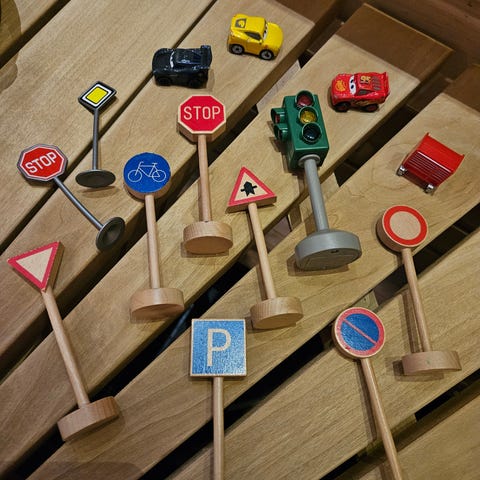 Liikennevalot autolle ja toisella puolella on valot jalan kulkijalle. Koko 12 cm. Patteri ei kuulu kauppaan.