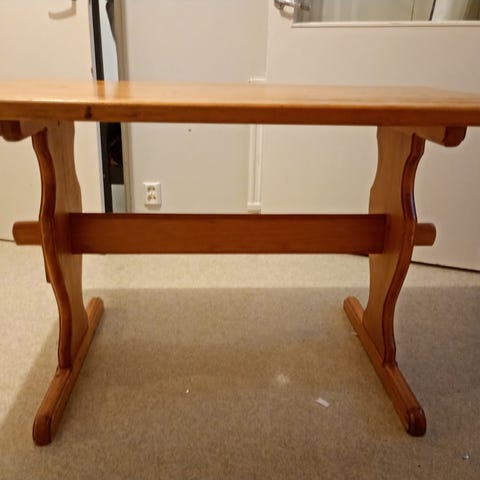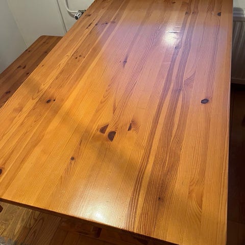 Kokopuinen tukeva pirttikalusto. Vaatii uuden maalipinnan. Suoraan lapsiperheen käytöstä, löytyy (vesiliukoisen) tussin jälkiä ja maalipinta kulunut etenkin tuoleista. Pöytä paremmassa kunnossa. Soveltuu myös ulkokäyttöön.