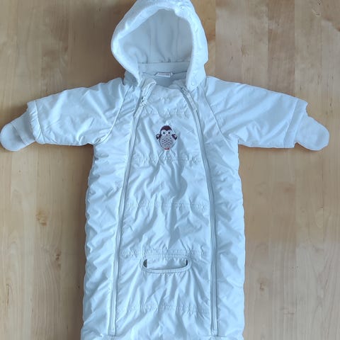 Valkoinen, siistikuntoinen Vauvan makuupussi / haalari kokoa 63. Saa kiinnitettyä turvavöihin!