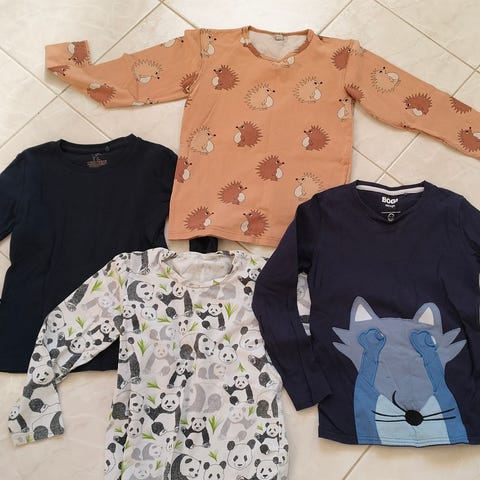Paljon käytetty 100% puuvillatrikoinen pitkähihainen paita. Etukappale villieläin-aiheinen. Värit haalistuneet alkuperäisestä, mutta ehjä, ja materiaali on miellyttävän pehmeää.