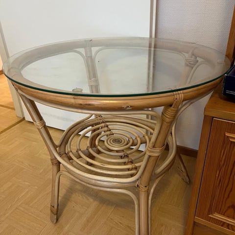 Pieni siisti rottinkipöytä,halkaisija 52cm ja korkeus 55cm.