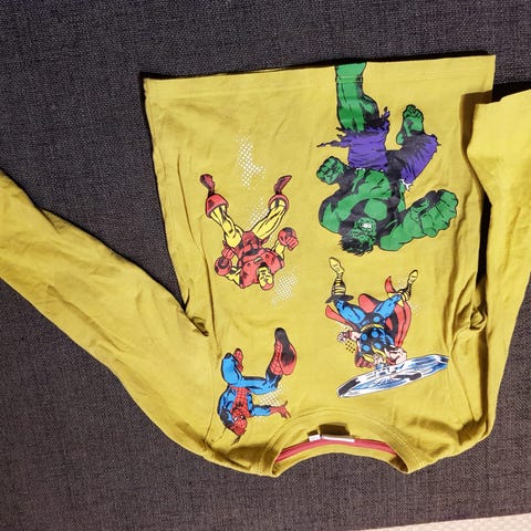 H&M collaripaita koossa 110/116cm. Paita on kuvioitu Marvel-hahmoilla.