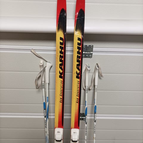 Karhun 120cm sukset NNN-siteillä, monot on Fischer kokoa 33, sisämitaltaan 205mm. Sauvat on 90cm Rex. Hyväkuntoinen paketti valmiina hiihtoon 100-110cm hiihtäjälle.