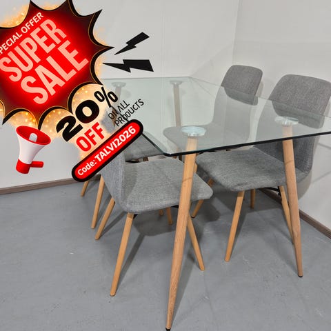 Ruokapöytä harmaalla pinnalla ja neljällä harmaalla tuolilla. Pöydän pinta on harmaa viilupinta. Tuolit ovat kankaalla verhoiltuja.