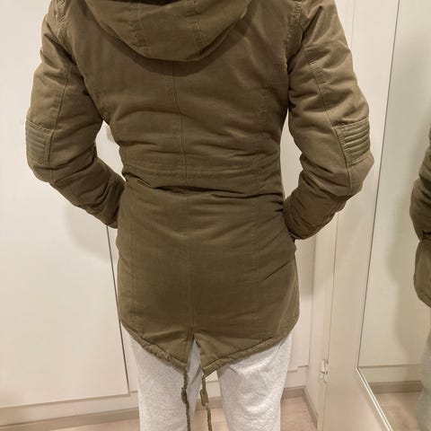 Zaran hyväkuntoinen parkatakki. Päälliskangas puuvillaa ja polyamidia, kestää aika hyvin vettä ja loskakeliä. Sisällä todella pehmoinen ja lämmin teddykarva, joka lämmittää kylmemmälläkin kelillä. Kaunis beigen värinen kangas. Ei mitään käytön jälkiä, sillä ei ole päässyt käyttöön. Pesty kerran suht miedon tuoksuisella pesuaineella. Kokomerkintä tosiaan M, ja menee aina L kokoisellekin, kuten kuvassa. Vyötäröä voi säätää kiristysnauhalla. Taskut löytyy sivuilta. Oikein kiva ja monikäyttöinen, lämmin takki!