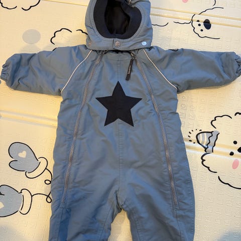 Racoon merkkinen vauvan ulkohaalari koko 74. Pinta kiiltävävää kangasta ja sisällä ohut vuori. Käytetty noin 15-10 asteen lämpötilassa ja autohaalarina.