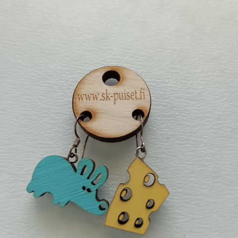 Kuvan mukaiset hopeiset hiiri aiheiset rinta- ja korvakorut. Isoimman hiirulaisen pituus noin 5 cm. Yht. Hinta 50€