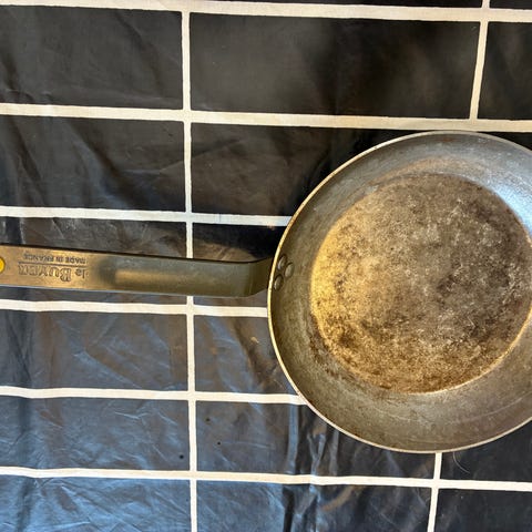 Korkeareunainen 32 cm halkaisija hiiliteräspannu.