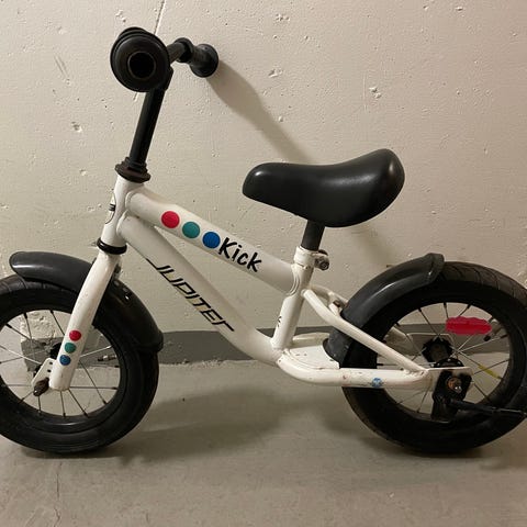 Ride-on lasten potkupyörä, jossa on vaaleanpunainen istuin ja ohjaustanko, valkoinen runko sekä siniset ja punaiset pyörät. Soveltuu pienten lasten käyttöön tasapainon ja liikkumisen harjoitteluun.