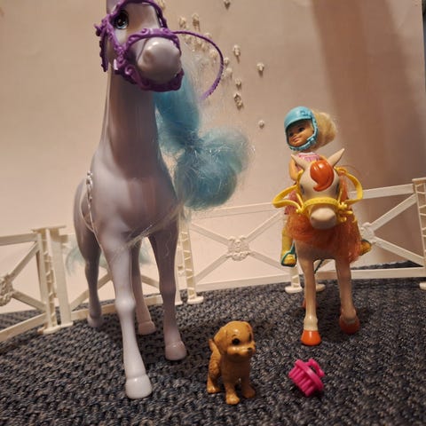 Hevosten säkäkorkeudet n. 5-9 cm. Hännät ja harjat voivat olla takkuuntuneita. Mukana tulee myös 5kpl harjoja, pieni omenasaavi ja ämpäri. Myös satulat, suitset ja satulahuovat tulevat mukaan. Satulat ja suitset ehjiä ja ne saa kiinni.