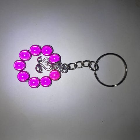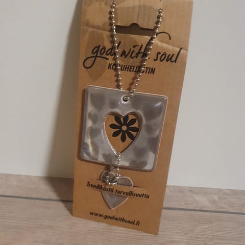 Heijastin, jossa on sinisiä helmiä ja keskellä sydänriipus. Ketju on unisex-malli, sopii kaikenikäisille ja -sukupuolisille käyttäjille. Materiaali ei ole tarkasti määritelty, mutta ketju ja avainrengas ovat metallia.
