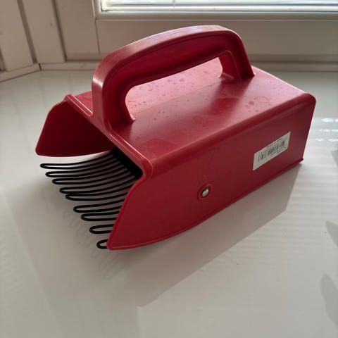 Punainen muovinen marjanpoimuri mustalla kahvalla