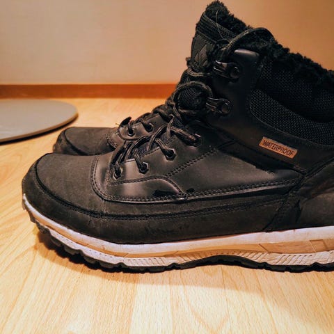 Kevätkauden käytössä olleet talvikengät. Hyväkuntoiset, kosteutta hylkivät, mutta eivät ihan vesikeliä kestä.