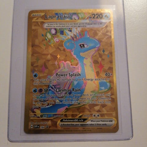 Pokémon Lapras EX keräilykortti, jossa on 220 HP. Kortissa on Power Splash -hyökkäys, joka tekee 40 vahinkoa ja lisää 40 vahinkoa jokaiseen kiinnitettyyn vesityyppiseen energiaan. Kortti sisältää myös Larimar Rain -ominaisuuden, joka antaa pelaajalle mahdollisuuden etsiä vesityyppisiä energiakortteja pakasta.