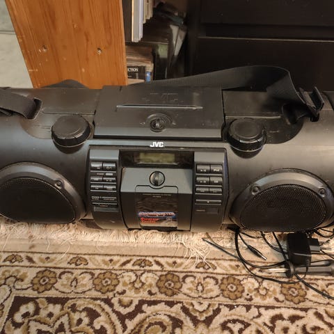 JVC RV-NB50 kannettava äänijärjestelmä, jossa on CD-soitin ja FM-radio ja iPod.Laite toimii verkkovirralla tai paristoilla (koko D, 10 kpl). Varustettu kahdella kaiuttimella ja kantokahvalla. Soveltuu äänentoistoon liikkeellä ollessa tai kotikäyttöön.