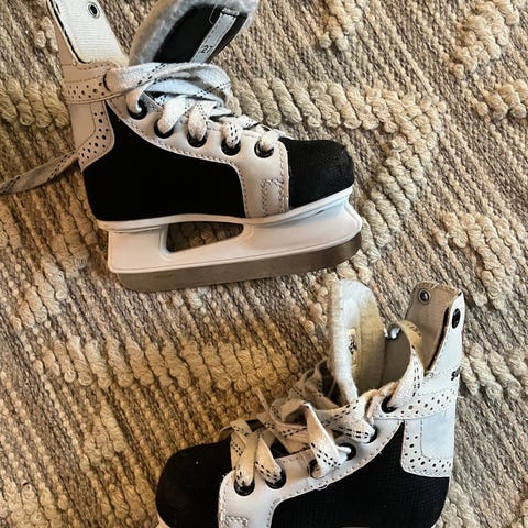 CCM Tackla jääkiekko luistimet lasten koossa 27. Luistimissa valkoinen ja musta väriyhdistelmä, sisävuori pehmeää materiaalia. Soveltuu jääkiekkoiluun lapsille.